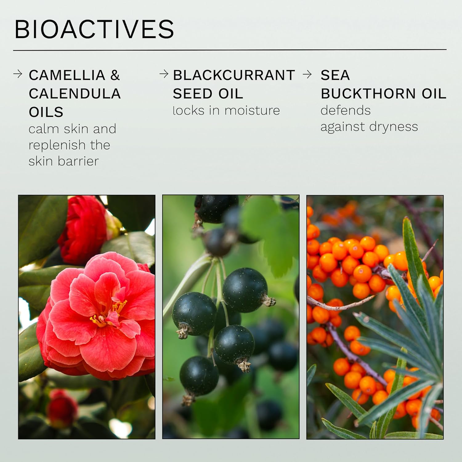 This soothing daily moisturiser is designed for sensitive and reactive skin. With blackcurrant seed oil, seabuckthorn, and camellia, it reduces redness, strengthens the skin barrier, and protects against pollution.
